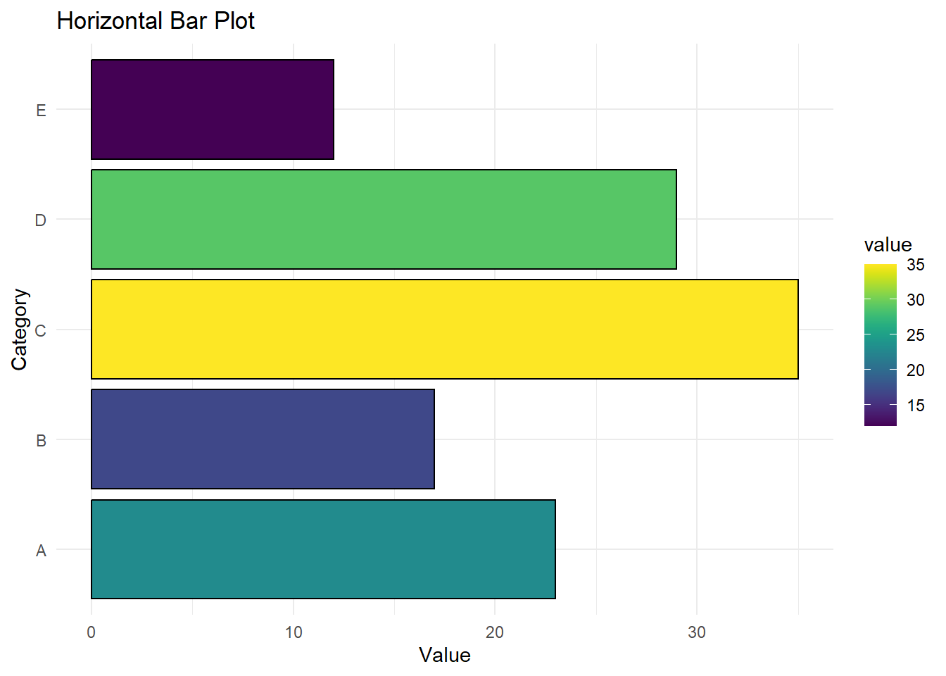 ggplot(data, aes(x = category, y = value, fill = value)) +