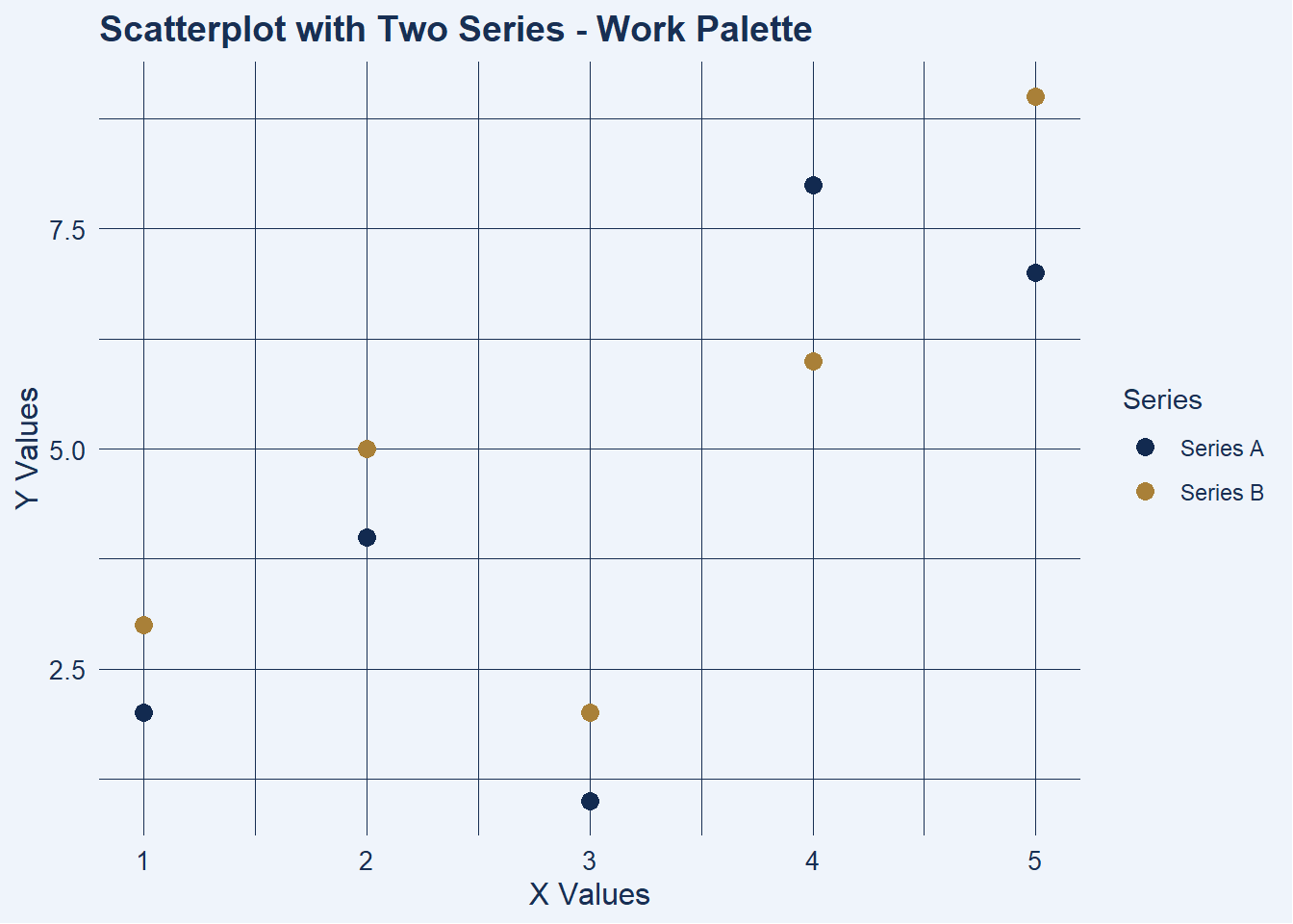 labs(title = "Scatterplot with Two Series - Work Palette",