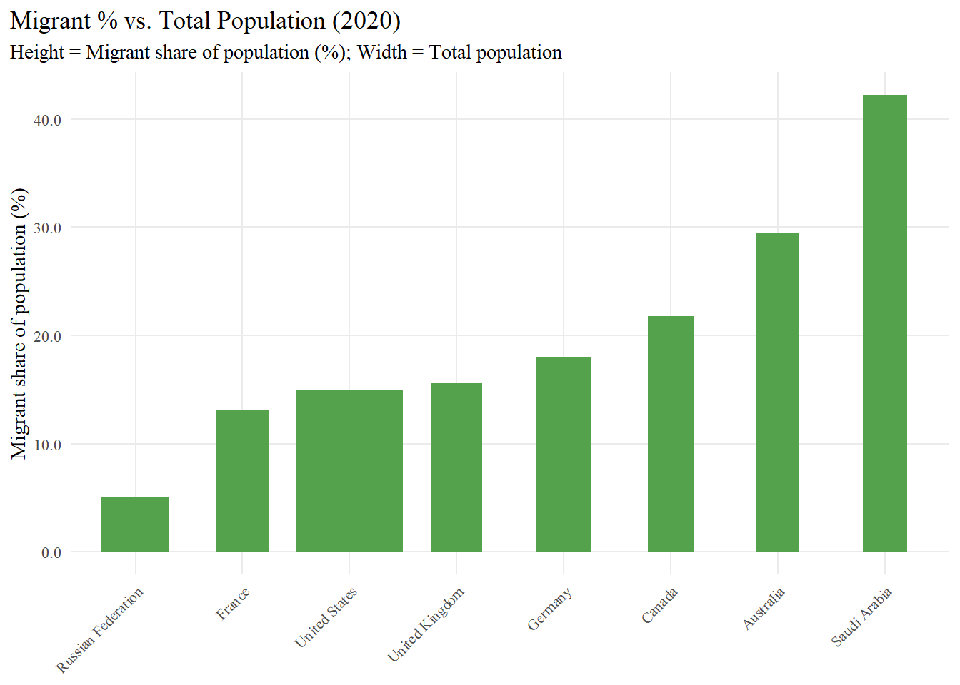 # Create Variable Width Column Chartp_vw <-ggplot(vw8, aes(x =reorder(country, `% Migrants`),y =`% Migrants`)) +geom_col(aes(width = width_scaled), fill ="#54A24B") +# Create the chartscale_y_continuous(labels =label_number(accuracy =0.1)) +labs(title ="Migrant % vs. Total Population (2020)",subtitle ="Height = Migrant share of population (%); Width = Total population",x =NULL,y ="Migrant share of population (%)" ) +theme_minimal(base_family ="serif") +theme(plot.title.position ="plot",panel.grid.minor =element_blank(),axis.text.x =element_text(angle =45, hjust =1, size =8) )p_vw