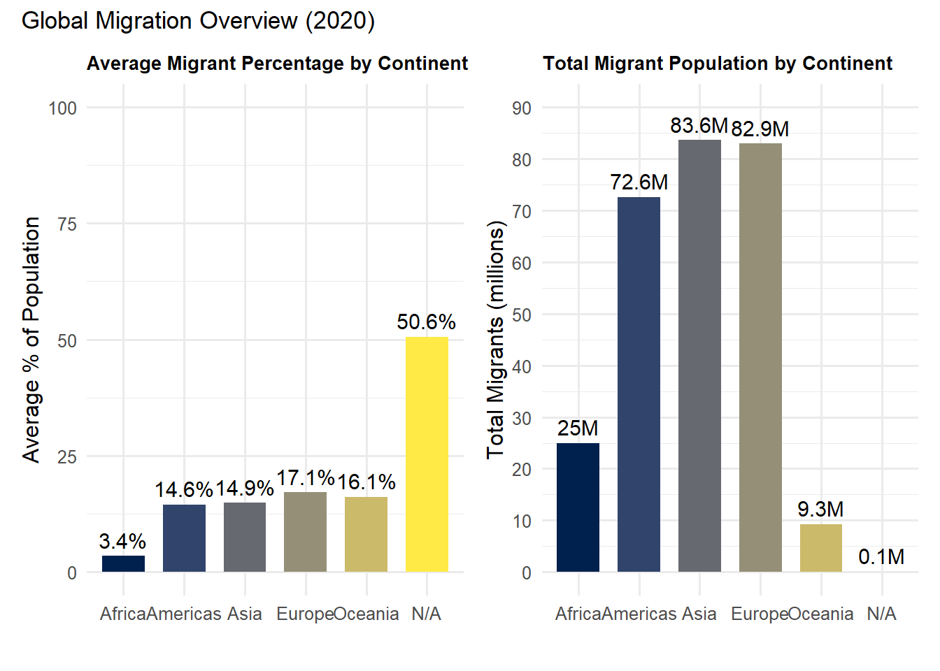 # Replace NA with "N/A"continent_summary$continent <-ifelse(is.na(continent_summary$continent),"N/A", continent_summary$continent)# Convert to factor with alphabetical levelscontinent_summary$continent <-factor( continent_summary$continent,levels =sort(unique(continent_summary$continent)))continent_levels <-c(setdiff(sort(unique(continent_summary$continent)), "N/A"), "N/A")continent_summary$continent <-factor(continent_summary$continent, levels = continent_levels)# Graph 1 Average Migrant %p1 <-ggplot(continent_summary, aes(x = continent, y = avg_migrant_pct, fill = continent)) +geom_col(width =0.7) +geom_text(aes(label =paste0(round(avg_migrant_pct, 1), "%")),vjust =-0.5, size =4) +scale_fill_viridis(discrete =TRUE, option ="E") +labs(title ="Average Migrant Percentage by Continent",x ="",y ="Average % of Population" ) +ylim(0, 100) +theme_minimal(base_size =12) +theme(legend.position ="none",plot.title =element_text(size =10, face ="bold") )#Graph 2 Total Migrantsp2 <-ggplot(continent_summary, aes(x = continent, y = total_migrants /1e6, fill = continent)) +geom_col(width =0.7) +geom_text(aes(label =paste0(round(total_migrants /1e6, 1), "M")),vjust =-0.5, size =4) +scale_fill_viridis(discrete =TRUE, option ="E") +scale_y_continuous(limits =c(0, 90), breaks =seq(0, 90, 10)) +labs(title ="Total Migrant Population by Continent",x ="",y ="Total Migrants (millions)" ) +theme_minimal(base_size =12) +theme(legend.position ="none",plot.title =element_text(size =10, face ="bold") )#Final Productprint((p1 + p2) +plot_annotation(title ="Global Migration Overview (2020)"))