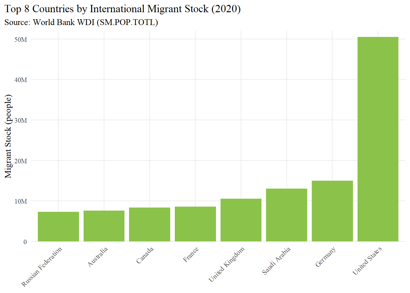 light_green <-"#8BC34A"p_top8_v <-ggplot(top8, aes(x = country, y = migrants_total)) +geom_col(fill = light_green) +scale_y_continuous(labels =label_number(scale_cut =cut_short_scale()),expand =expansion(mult =c(0, 0.03)) ) +labs(title ="Top 8 Countries by International Migrant Stock (2020)",subtitle ="Source: World Bank WDI (SM.POP.TOTL)",x =NULL, y ="Migrant Stock (people)" ) +theme_minimal(base_family ="serif") +theme(plot.title.position ="plot",panel.grid.minor =element_blank(),axis.text.x =element_text(angle =45, hjust =1))p_top8_v